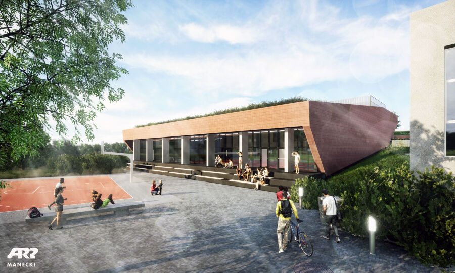 Zakres przedsięwzięcia obejmuje także kompleksowe zagospodarowanie terenu przyszkolnego. W ramach prac powstaną ciągi pieszo-jezdne, miejsca parkingowe, place oraz chodniki zlokalizowane wokół nowego obiektu i istniejącej zabudowy. Projekt zakłada harmonijne wkomponowanie pływalni w otoczenie, z zachowaniem spójnej kolorystyki oraz nowoczesnej formy architektonicznej.