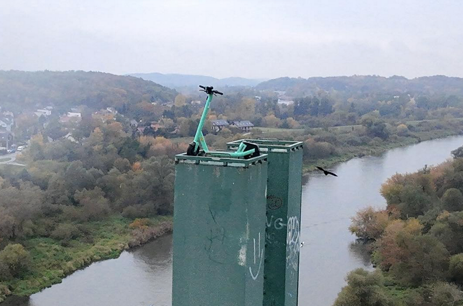 Niecodzienny i niebezpieczny widok zaskoczył mieszkańców Krakowa. Na szczycie 40-metrowego pylonu kładki technologicznej nad Wisłą, łączącej Przegorzały z Pychowicami, ktoś postawił elektryczną hulajnogę. Choć na pierwszy rzut oka może to wyglądać jak nietypowa instalacja artystyczna, w rzeczywistości to niebezpieczny wybryk, który mógł skończyć się tragicznie.