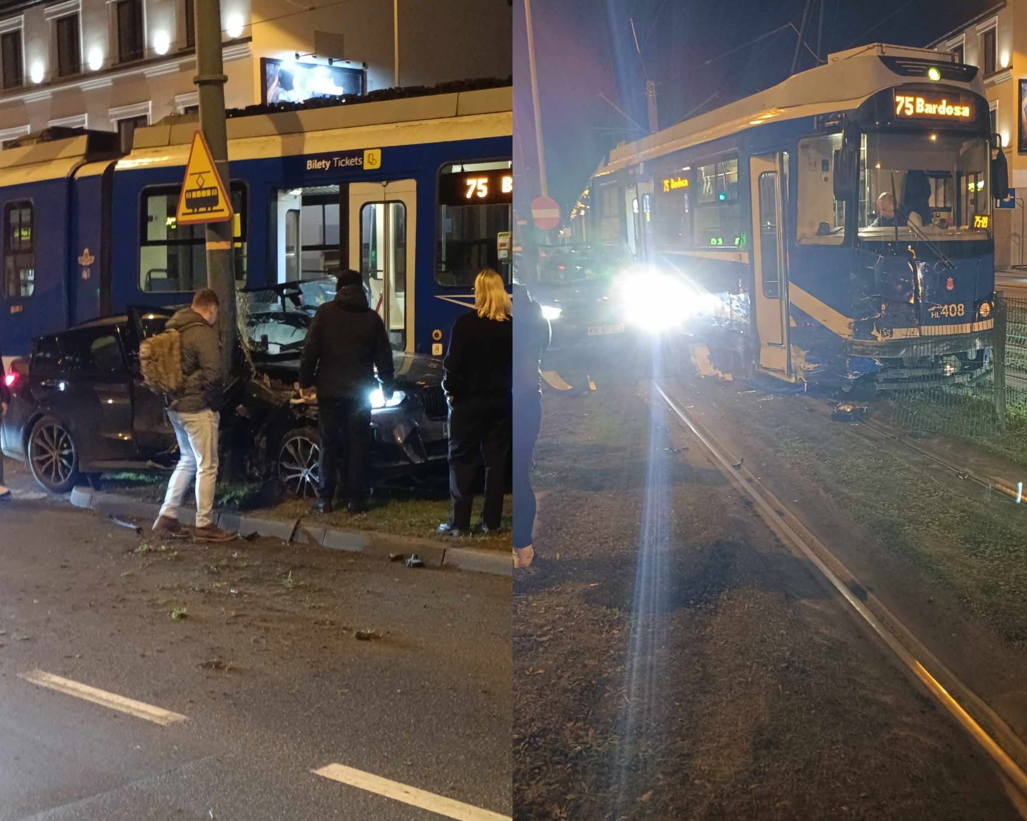 Tramwaj zderzył się tam z samochodem osobowym, co spowodowało całkowite wstrzymanie ruchu w obu kierunkach.